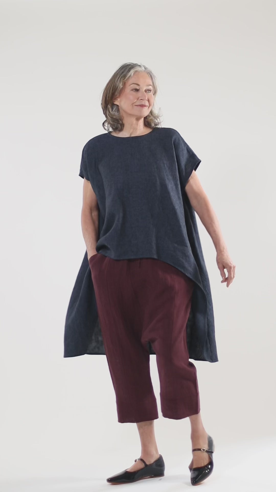 The Essentials Collection Aurora Top in navy linen has a simple round neckline, a button & loop closure at the back, dropped sleeves and boxy shaping throughout the body. A cropped front hemline gives way to a dramatic swooping back hemline.