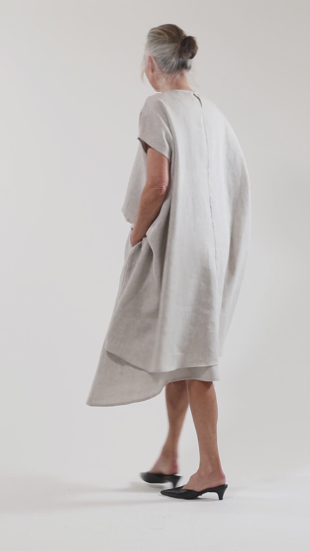 The Essentials Collection Aurora Top in neutral linen has a simple round neckline, a button & loop closure at the back, dropped sleeves and boxy shaping throughout the body. A cropped front hemline gives way to a dramatic swooping back hemline.