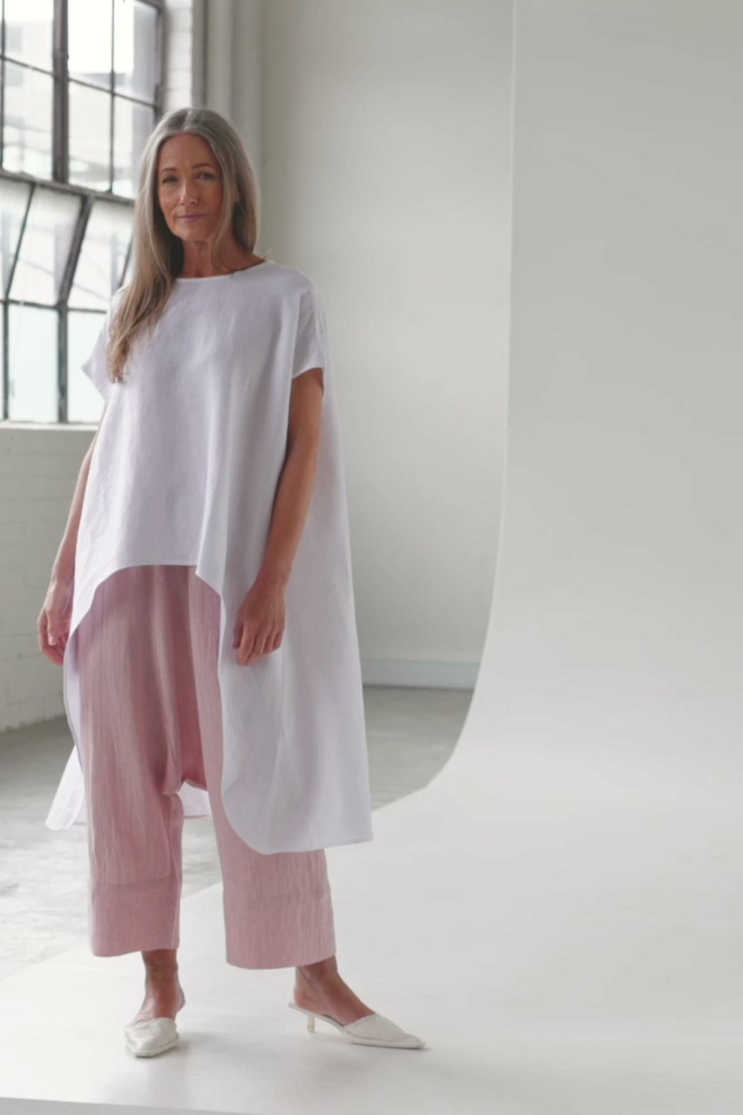 The Aurora Top is a statement garment. It has a simple round neckline, a button-and-loop closure at the back, dropped sleeves and boxy shaping throughout the body. A cropped front hemline gives way to a dramatic swooping back hemline. Aurora cleverly appears dress-like from the back, and the shorter hem up front creates a beautiful frame for the pieces worn below. This is a simple but ingenious design from our early archives.