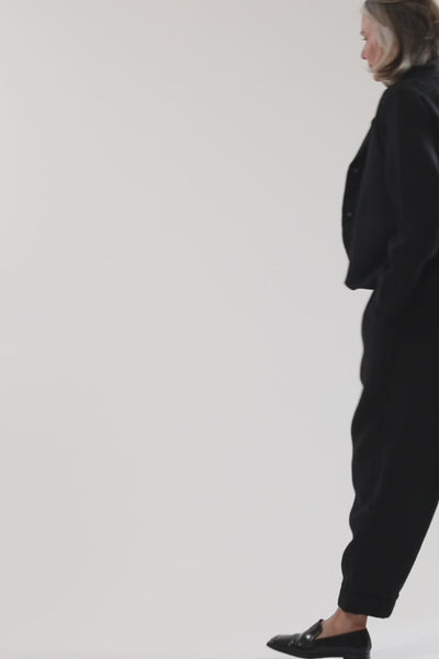 The Essentials Collection Conran Blazer in black linen is a stunning single-breasted cropped-length linen jacket hitting at high hip with a beautiful curved front hemline. Conran's design details are exquisite including two flat welt pockets on the inside and luxe self-lined front jacket panels.