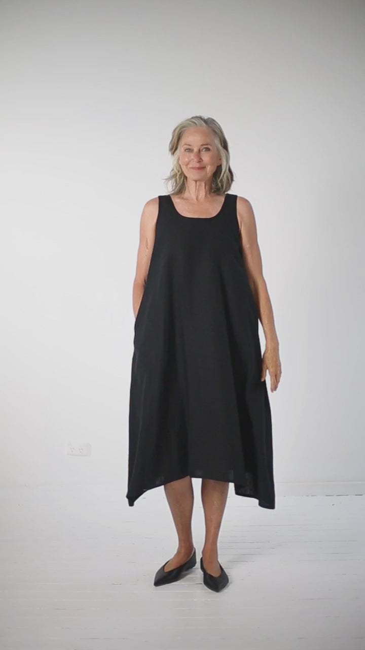 The Essentials Collection Danni Slip Dress in black linen is a simple a-line-shaped dress with generous shoulder coverage and a scooped neckline. Deep pockets are hidden in the side seams for added functionality. This midi-length dress will hit mid-calf on most.