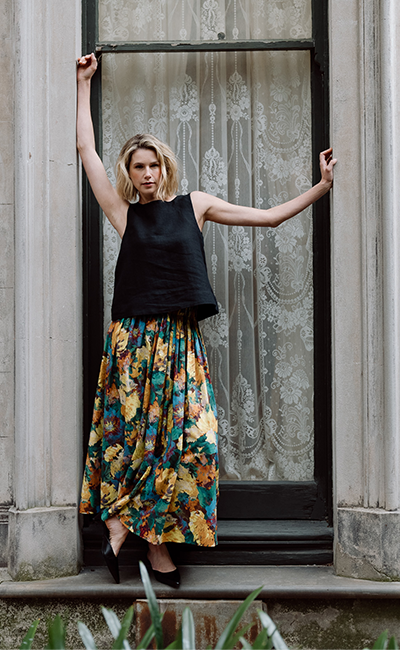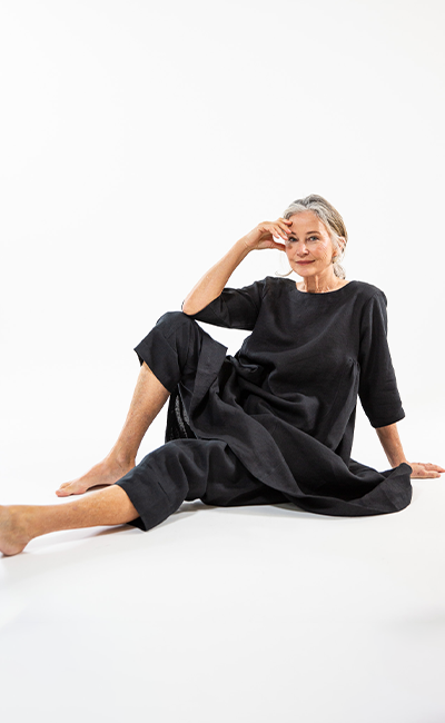 This linen dress can accommodate a shirt or a lightweight knit layer beneath it. It works well as a foundation layer under a vest or jacket. It also looks incredible with a relaxed fit top layered over it such as the Tommy Top.