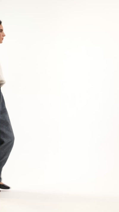 The Easton Pant is precisely cut from Navy pinstripe linen, contrasting a rich inky shade with soft ecru, for a pant that is effortlessly elevated. The high-waisted silhouette falls into an effortlessly elegant wide leg, with feature pressed creases that flatter the waist.