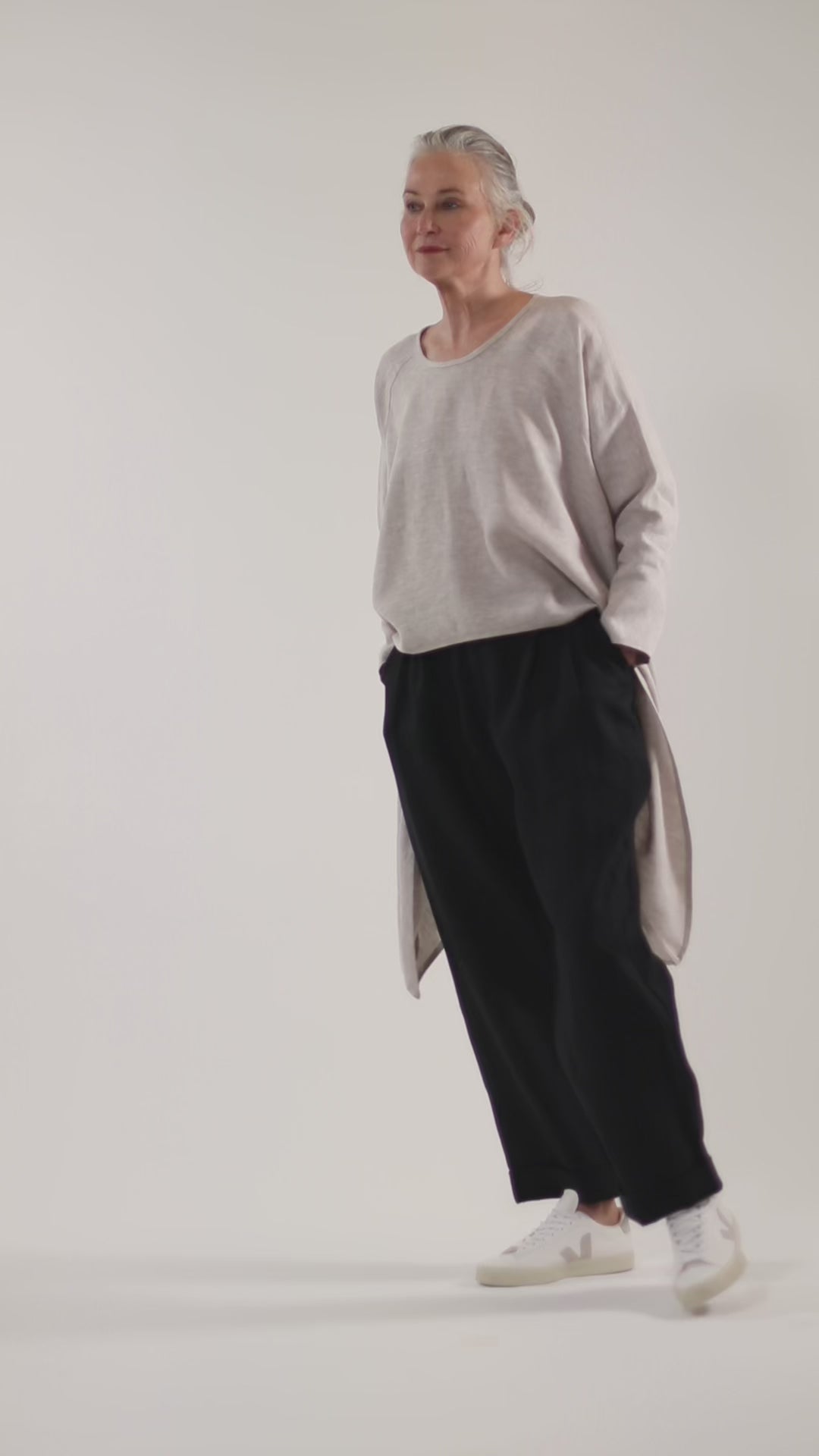 The Essentials Collection Emili Top in neutral linen makes a long-awaited return to our core garment lineup. It is a statement shape featuring elongated side panels. The neckline is round and the sleeves are raglan and taper in at the cuff. This is a best-selling style and we are delighted to re-introduce it.