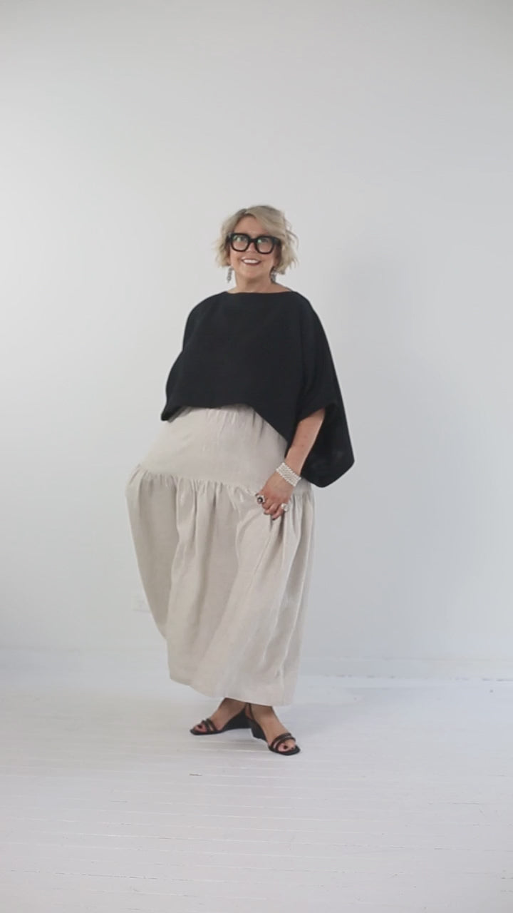The skirt is a-line-shaped with a second tier gathered to the top layer of the skirt. Pockets disappear into the side seams. Elegant, comfortable & flattering. This skirt is very easily taken up if desired (it has a simple rolled hem).