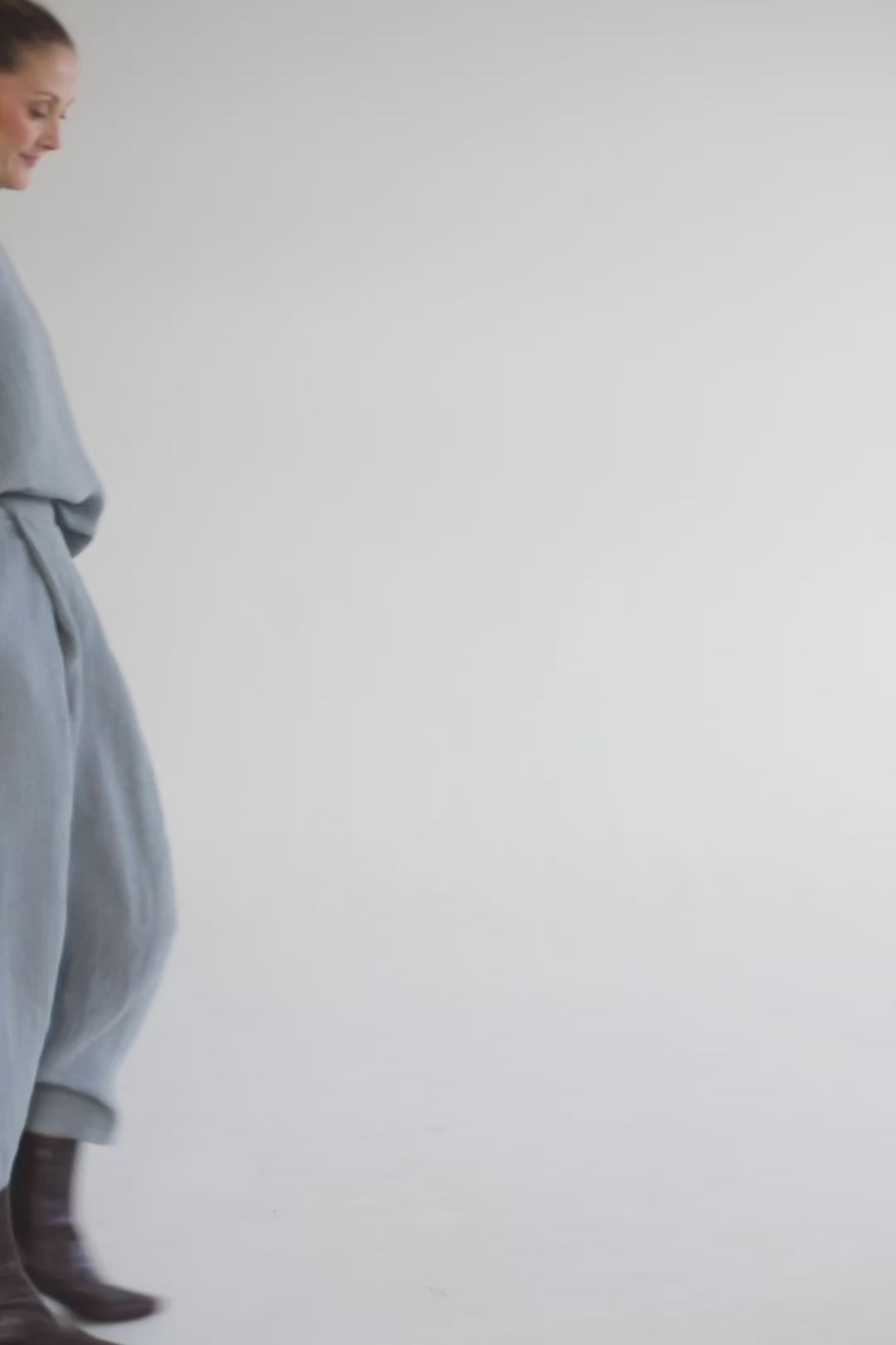 The Koi Pant is effortlessly cut in a flowy Dutch Blue Stripe linen, contrasting soft blue with fine ivory striping for a fresh and refined look. The relaxed harem-style silhouette features a dropped crotch and a distinctive crossover front with asymmetrical pleating and a button closure.