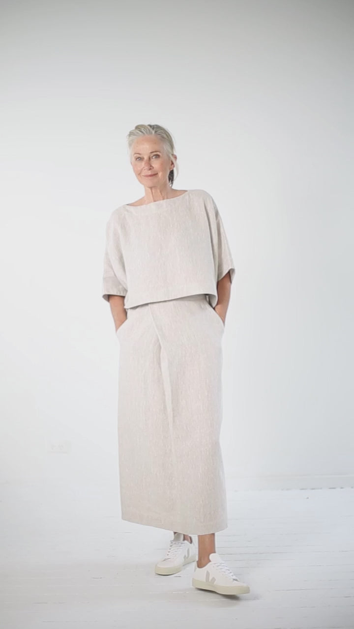 The Essentials Collection Koi Skirt in neutral linen is a long-line pencil skirt based on our popular Koi Pant design. A cross-over asymmetrical pleat detail and button closure provide interest at the front of the skirt.