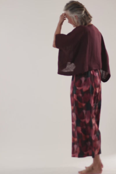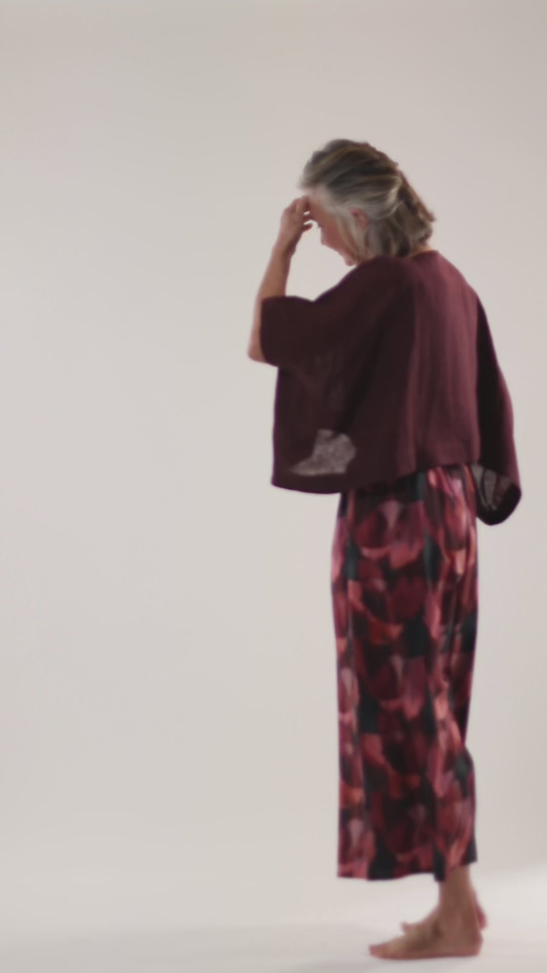 The Essentials Collection Lauri Culottes in Ikat Tulip are floaty, elegant and incredibly comfortable. Elastic at the back provides a secure and comfortable fit. The front waistband is flat. Soft gathering from the waistband falls to a luxe, wide-legged pant that hits at a 7/8 length (on most). These pants have deep pockets positioned in the side seams, and the fullness of the silhouette creates a skirt-like illusion when the legs are together. Comfort has been enhanced with a luxe cotton lining.