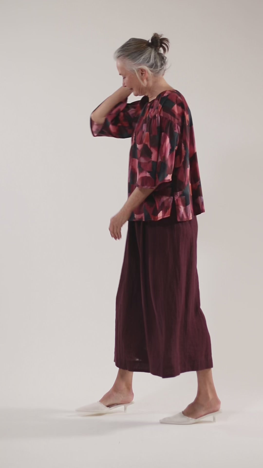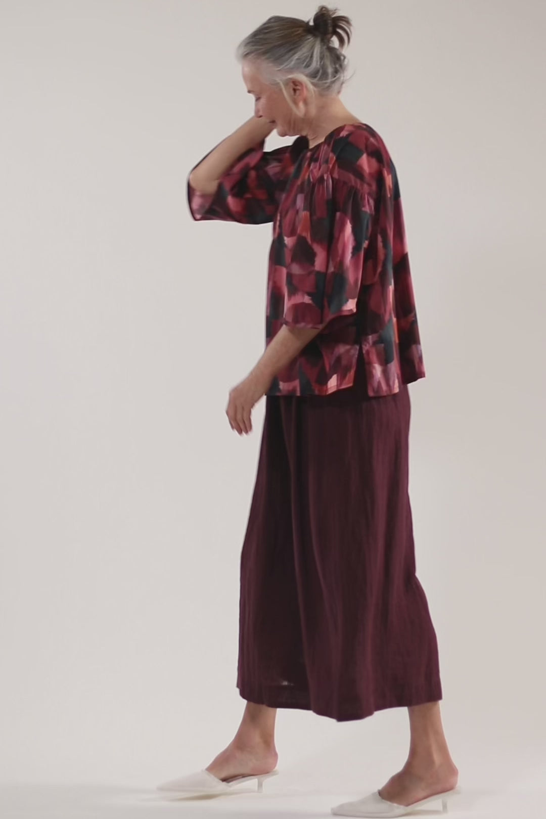 The Essentials Collection Lauri Culotte in merlot linen is floaty, elegant and incredibly comfortable. Elastic at the back provides a secure and comfortable fit. The front waistband is flat. Soft gathering from the waistband falls to a luxe, wide-legged pant that hits at a 7/8 length (on most).