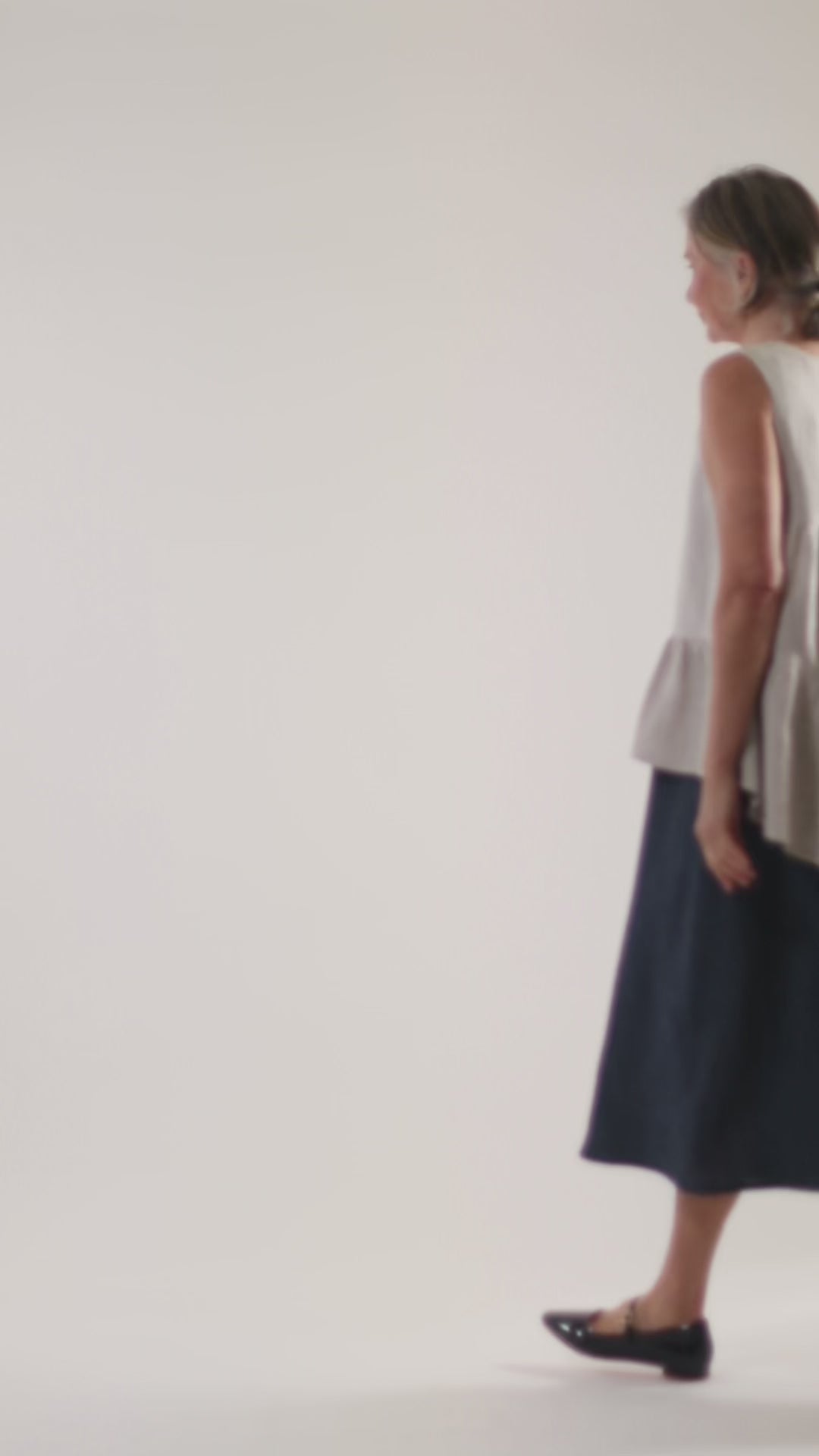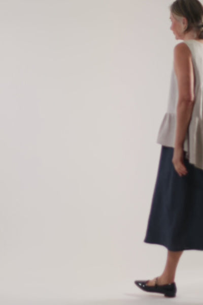 The Mao Trapeze Top in neutral linen is an easy-wearing sleeveless top with a feminine feel. The top features a gathered peplum through the front and tiered panels through the back that drop down, creating a variegated hemline.