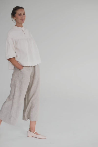 The Oliver Pant is smartly tailored in a Elm Stripe linen, contrasting soft clay with fine ivory striping for a fresh and refined look. A best-selling ES silhouette, the Oliver features a subtly flared leg that falls to a flattering slightly cropped 7/8 length.