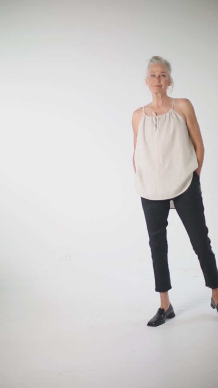 The Petunia Top in neutral linen is an elevated singlet-style top. It is wonderful worn solo on a hot summer day and equally as perfect as a layering garment under a jacket.
