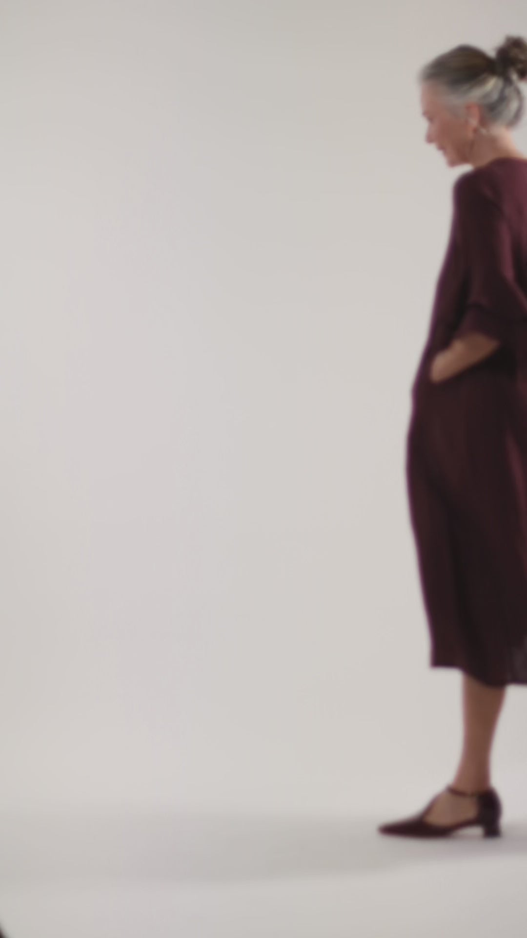 The Essentials Collection Prudence Dress in Merlot linen is a statement style, lending itself to "dressy" occasions. The bodice is gently a-lined in shape with godet panel inserts at the side seams for controlled fullness. The v-neckline is flattering, and the set-in sleeve adds a tailored vibe.