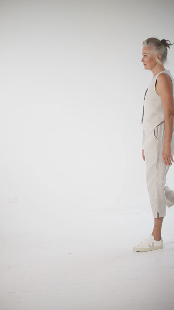 The Essentials Collection Teddy Pant in neutral linen has a relaxed, elasticated waistband with a subtle frill detail at the top that adds no bulk. The waistband has belt loops. A tapered leg provides a flattering silhouette without compromising room and fit through the hips.